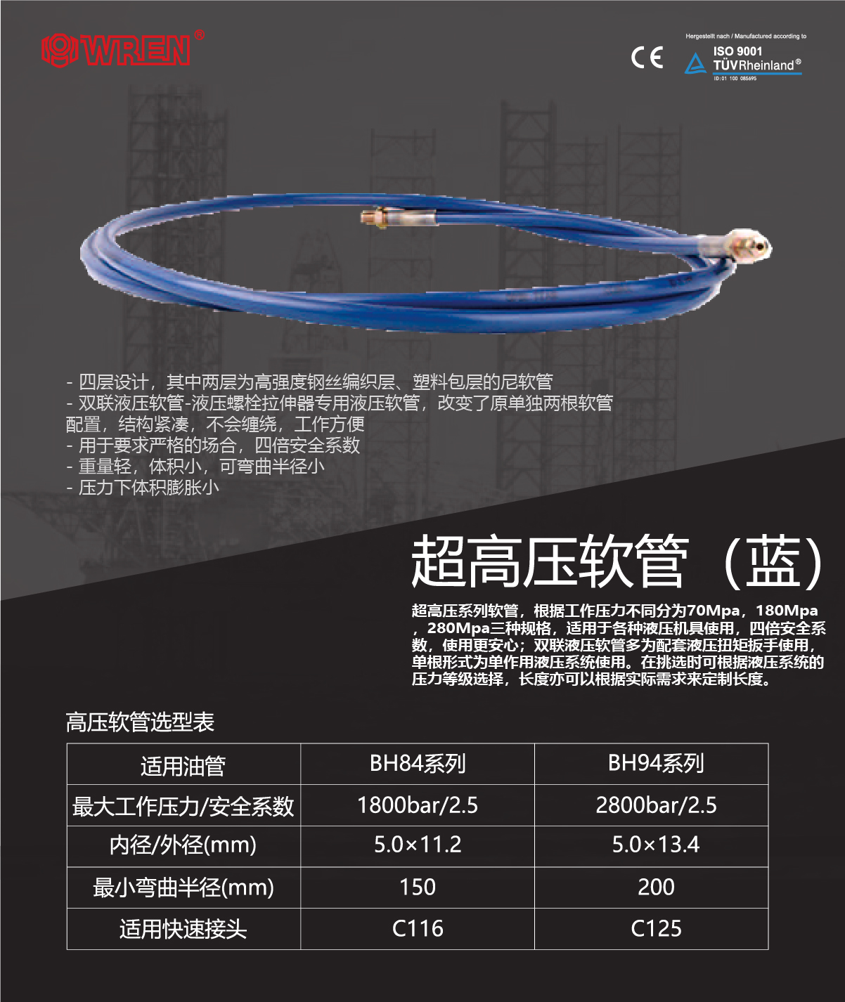 -四層設(shè)計,其中兩層為高強(qiáng)度鋼絲編織層、塑料包層的尼軟管